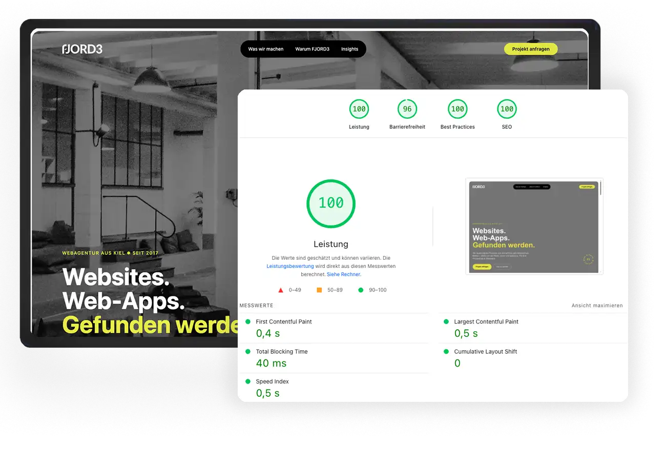 Core Web Vitals im grünen Bereich. Mit modernen Frontends erreichen wir beste Werte.